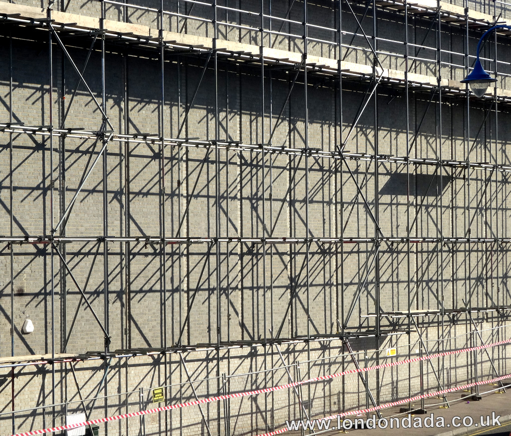 Scaffold complex with shadows cast onto brickwork facade; Whitechapel EC2.