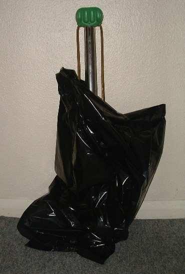 Concrete conceptual work ( A Bullworker TM standing in a black bin liner leaning against a wall )