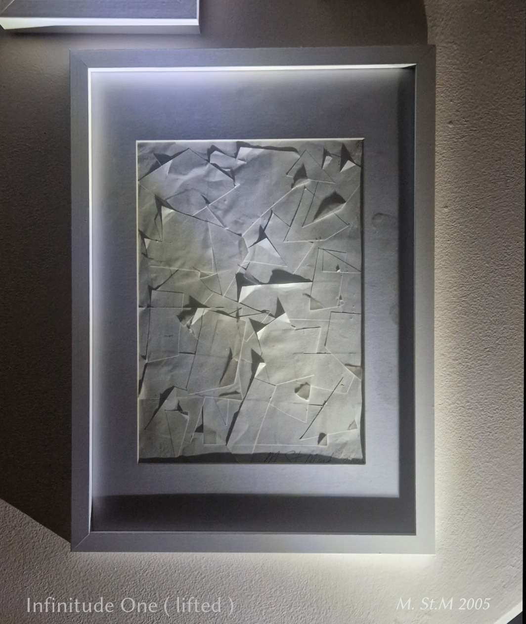 Update 2026, the artwork in varied adjustments, the flattened edges of the white snippets that have come unglued over 21 years are upturned to create a new and still infinitely variable interplay between shadow and light depending on the angle of the source lighting.