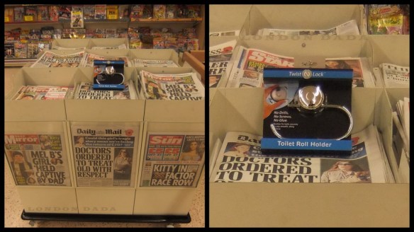( Bespoke instore tabloid newspaper stand j /w “Twist ‘n Lock” toilet roll holder. )