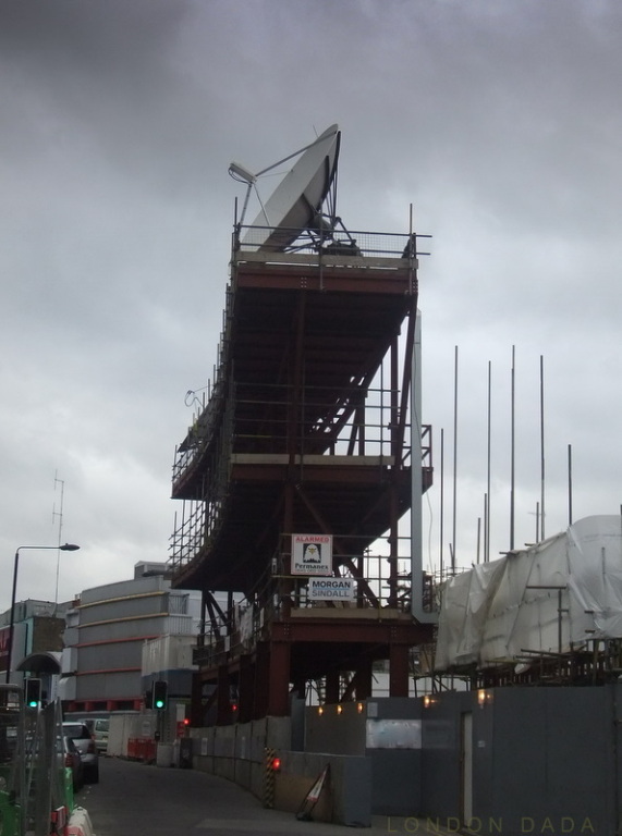 The incredible satellite dish (one of two) dominating the skyline and belittling the steel girder skeleton of its new build support, struck the eye as interestingly unusual and in an as then ( Dec ’11 ) vague sense promising some kind of sinister potential along social commentary lines; the image and its long deliberated-over title eventually coalescing.