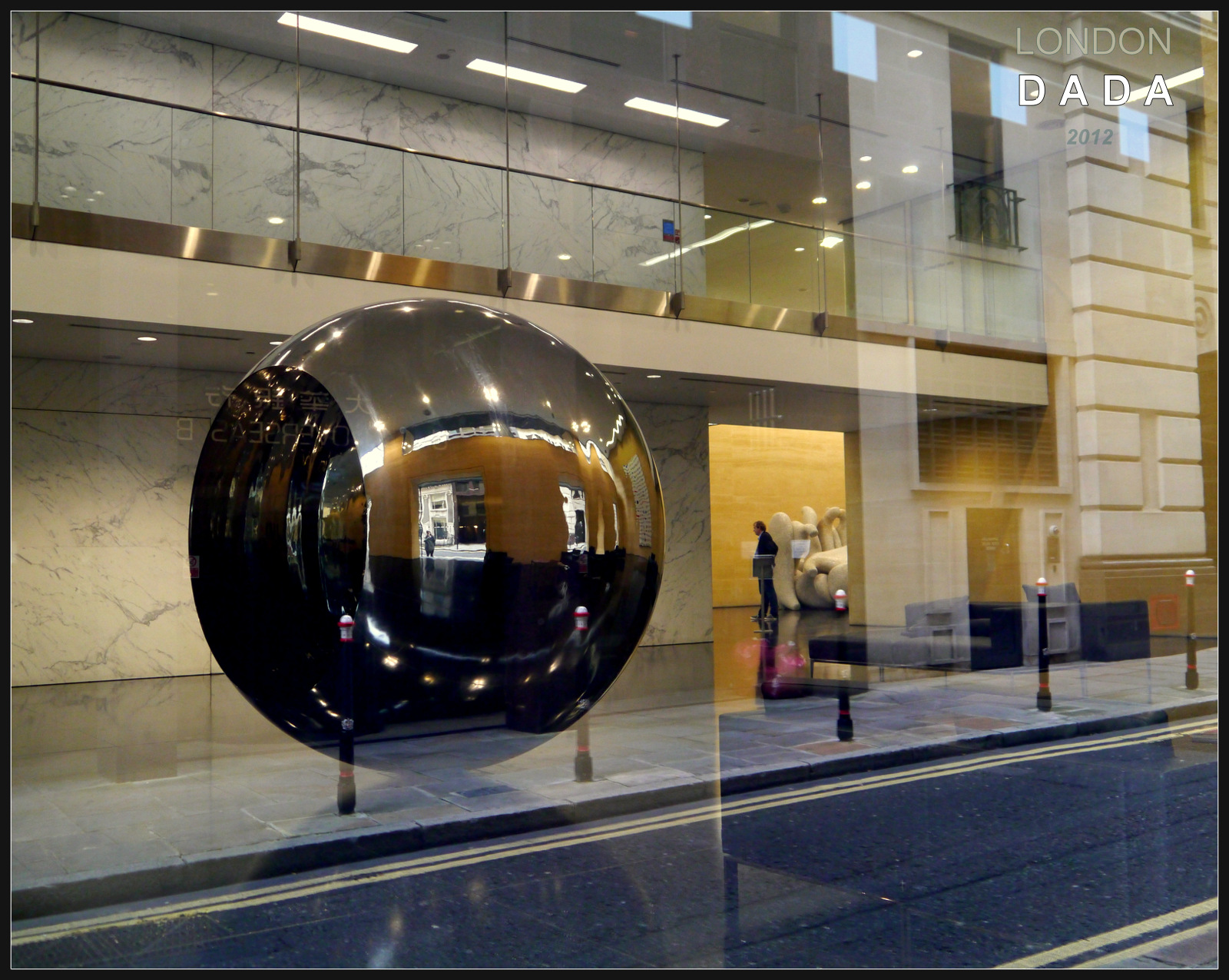 Location; Deutsche Bank London offices, October 2012. Inside the lavishly-appointed reception lobby reside artworks by Anish Kapoor ( mirrored stainless steel ball titled ” Turning the world upside down” (1996); and by Damien Hirst ( spot painting “Biotin-Maleimide” (1995).