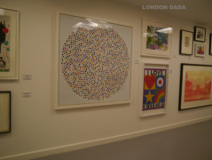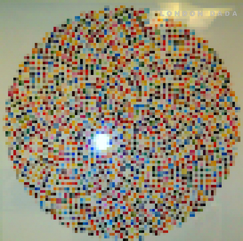 Flash photograph of spot painting ” Valium” by Damien Hirst from January 2013, enhanced and broken down into pixelation through digital image manipulation, creating a distinct new appropriation work, the intention being to trend art away from its unhealthy monopolization by the big players with their cash cow artists, here making a Damien Hirst (appropriation) affordable to the public.