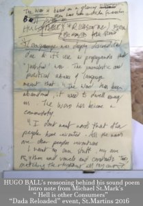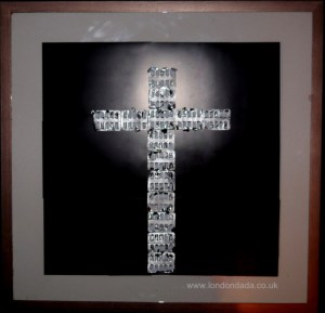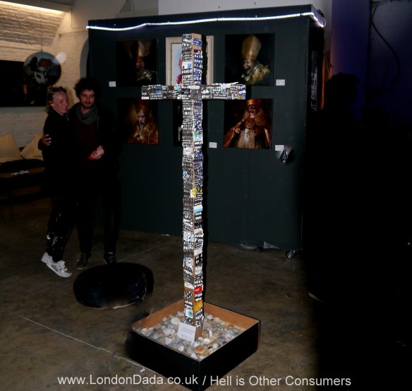 Completed Work installed at Underdog Gallery London for the Zurich meets London Dada centennial event, May 22nd 2016 and ( below ) featured centre-boxing ring stage during performance of ” Hell is Other Consumers ” at Central St.Martins West Handyside canopy.