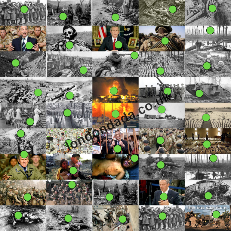 A digital collage featuring images from WW1 and the Iraq war impregnated with green holes, green being the opposite (contrasting ) colour to (blood) red; symbolizing the acute need for radical change in consciousnesses in humanity; for each individual to be shot with “bullets of peace”.
