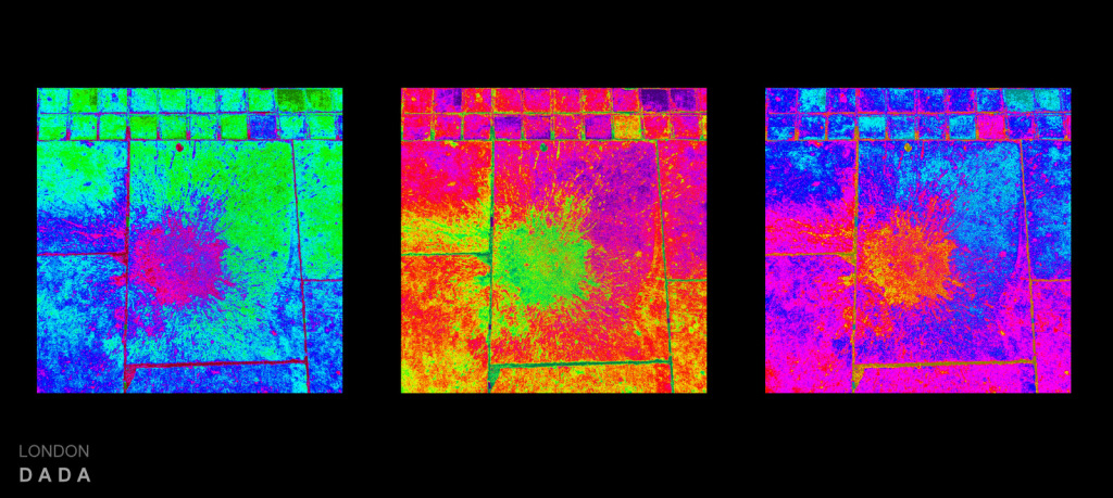 Triptych.  Selection of 3 heat map settings in PS based on an original photograph ( below ) of a pavement  vomit splash stain directly outside a Shoreditch pub. Dada – art that encompasses, and offers perception on, the whole of life.