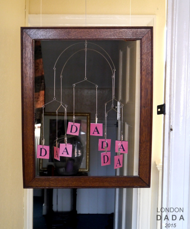 10-clip wire Mobile attaching x10 double-sided cutout letters in the same typeface and Indian red background as was used on the cover of Dada 1, issued by the original Dadaists of 1916 at Cabaret Voltire, suspended freely from a single wire . The x5 D & x5 A letters are suspended uniformly from a turn-of-the-century oak picture frame and hang and move randomly within the static frame which is suspended by 2 translucent nylon cords from above.