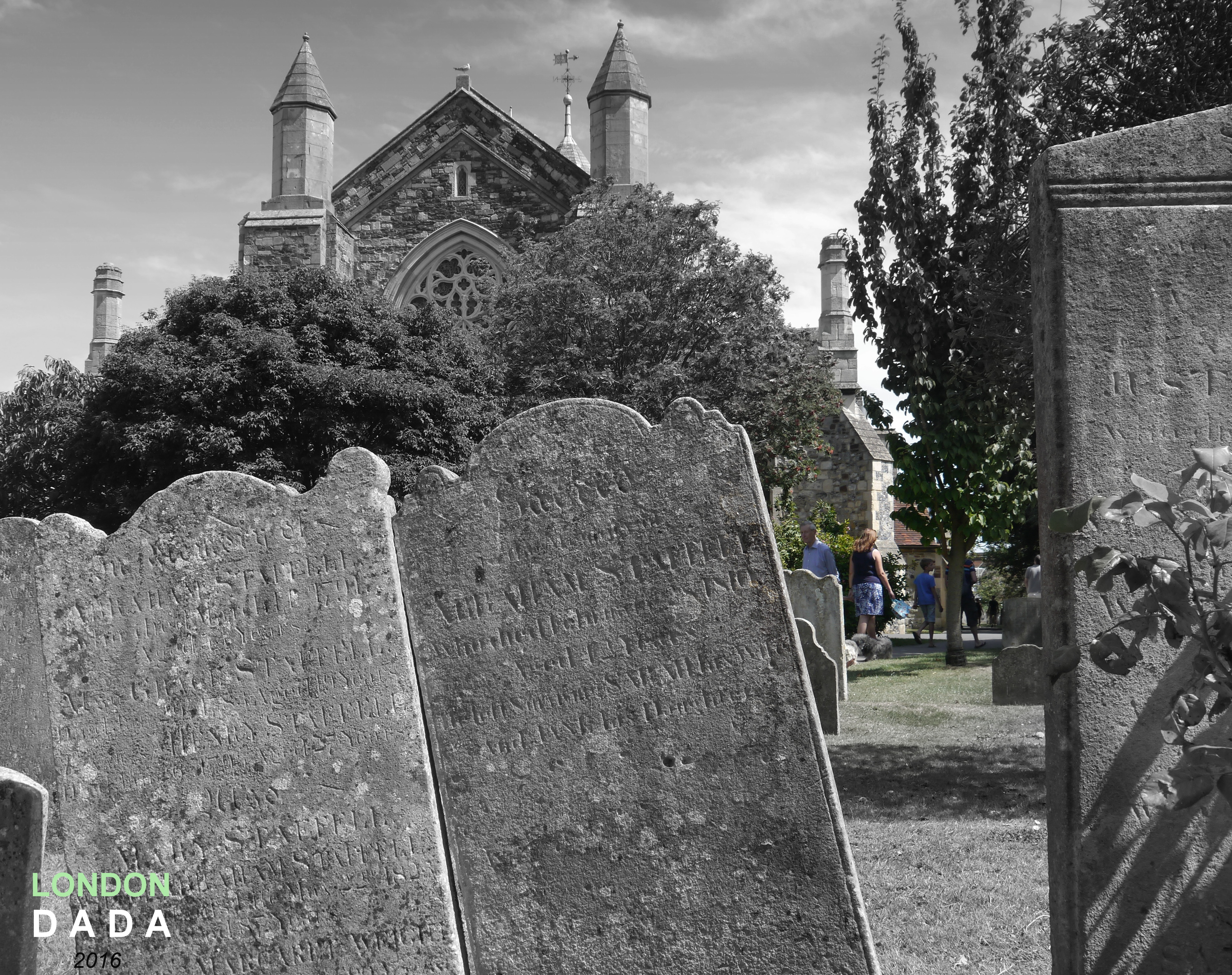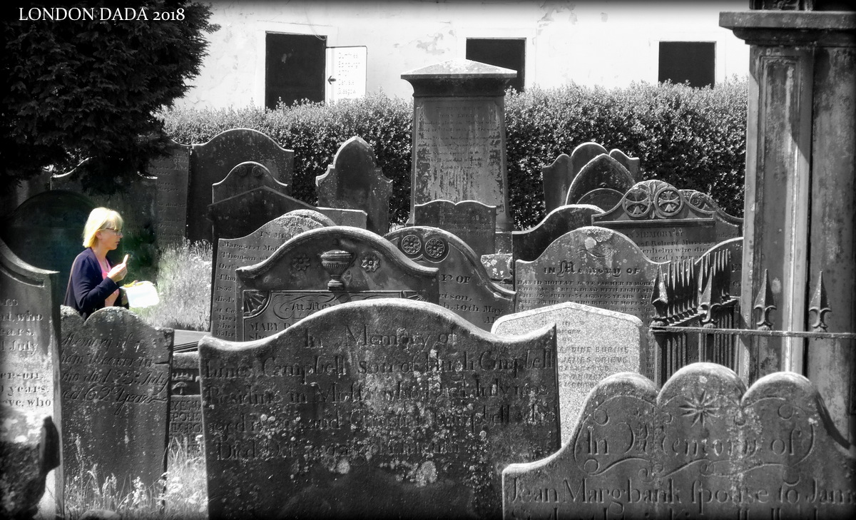Moffat Graveyard & tombstone-perusing woman with chips. Borders.