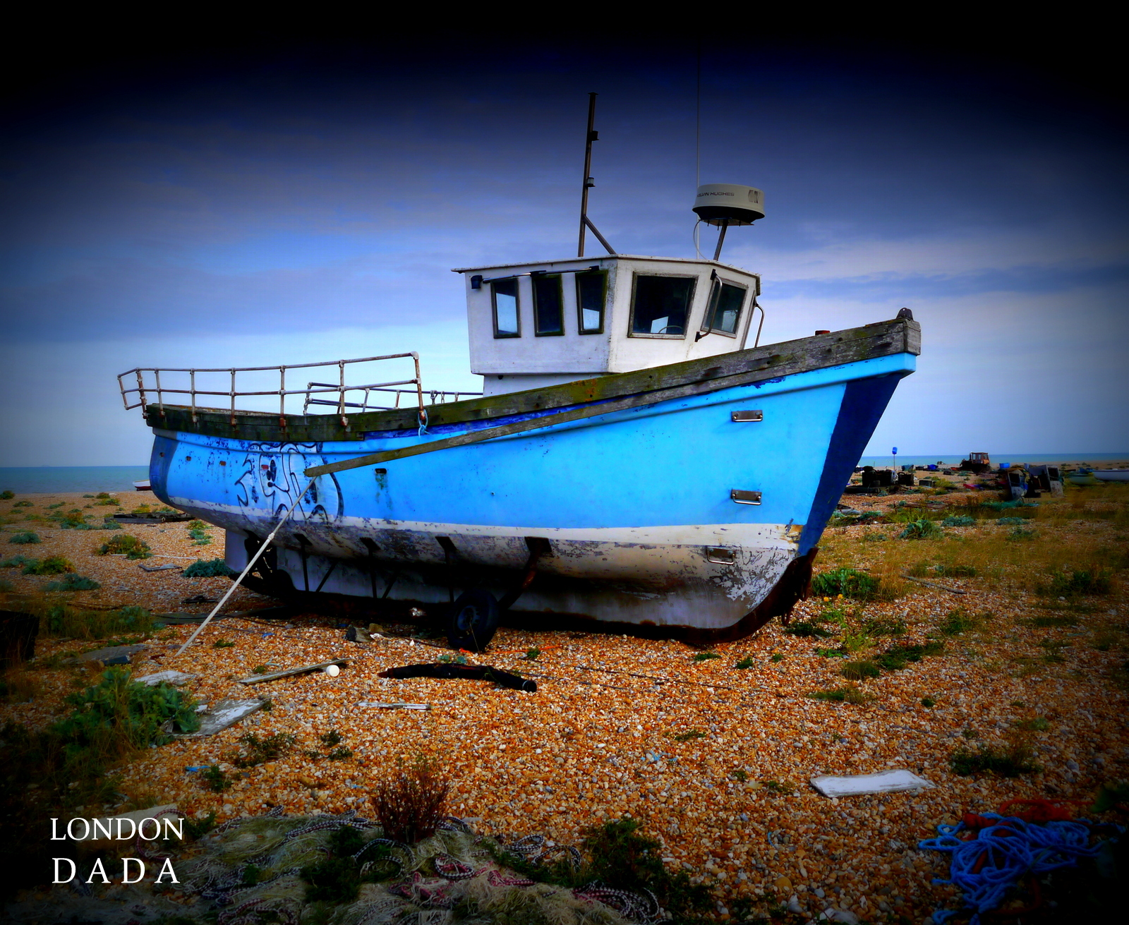 Photograph from 2015; dysfunctional and counter-directional boat, Dungeness E. Sussex