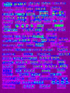 The word DADA repeated in a hundred different typefaces, digitally processed through several sequences. Relevant also in the respect that typography experimentation played a big part in Dada’s visual impact, especially mixed in with important photo montage Works such as those by John Heartfield.