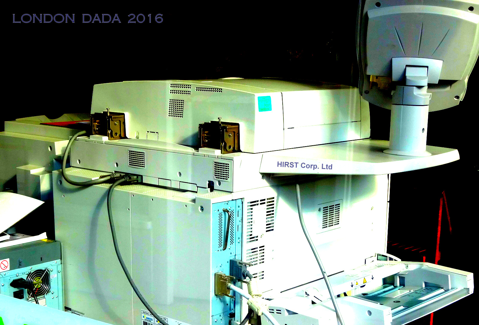 Backside connections of a sundry commercial laser copier in an office services shop window. Specialist in skull, butterfly, spots, medicine and human/animal anatomy polished copy enlargements