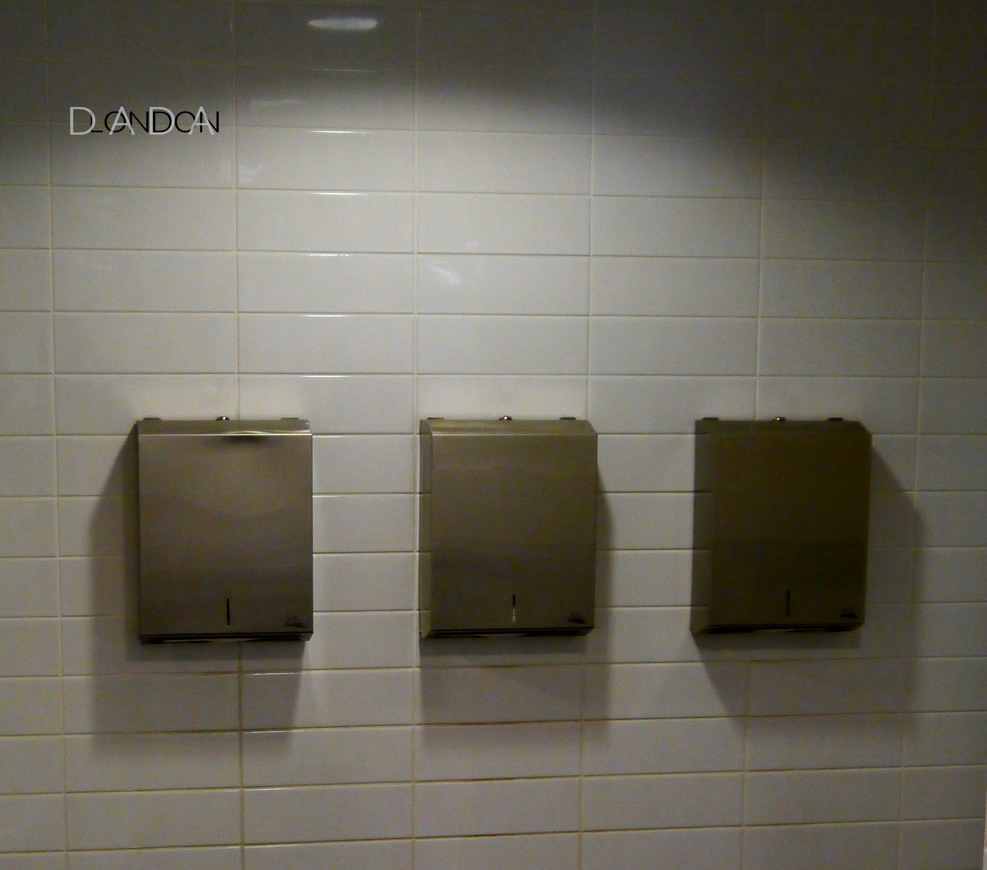 Saatchi Gallery Gents washroom, three steel paper towel dispensers on white tiling