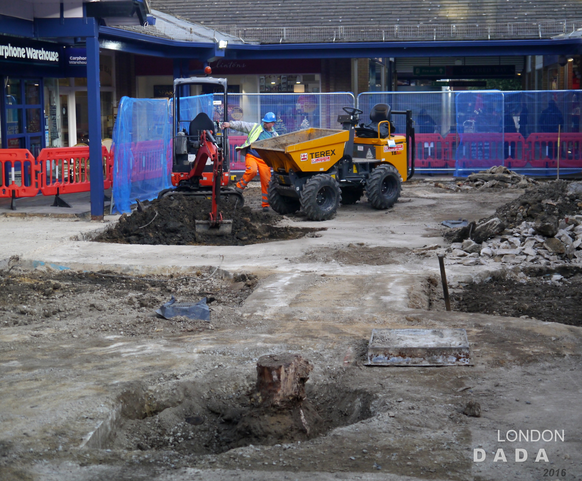 Full-swing full pedestrianisation of former pedestrian area within The Spires shopping precinct, Barnet N. London; that formerly held a small central garden with children’s play area, customer seating and tree ( foreground stump, cut and with potentially intrusive roots encased in concrete )