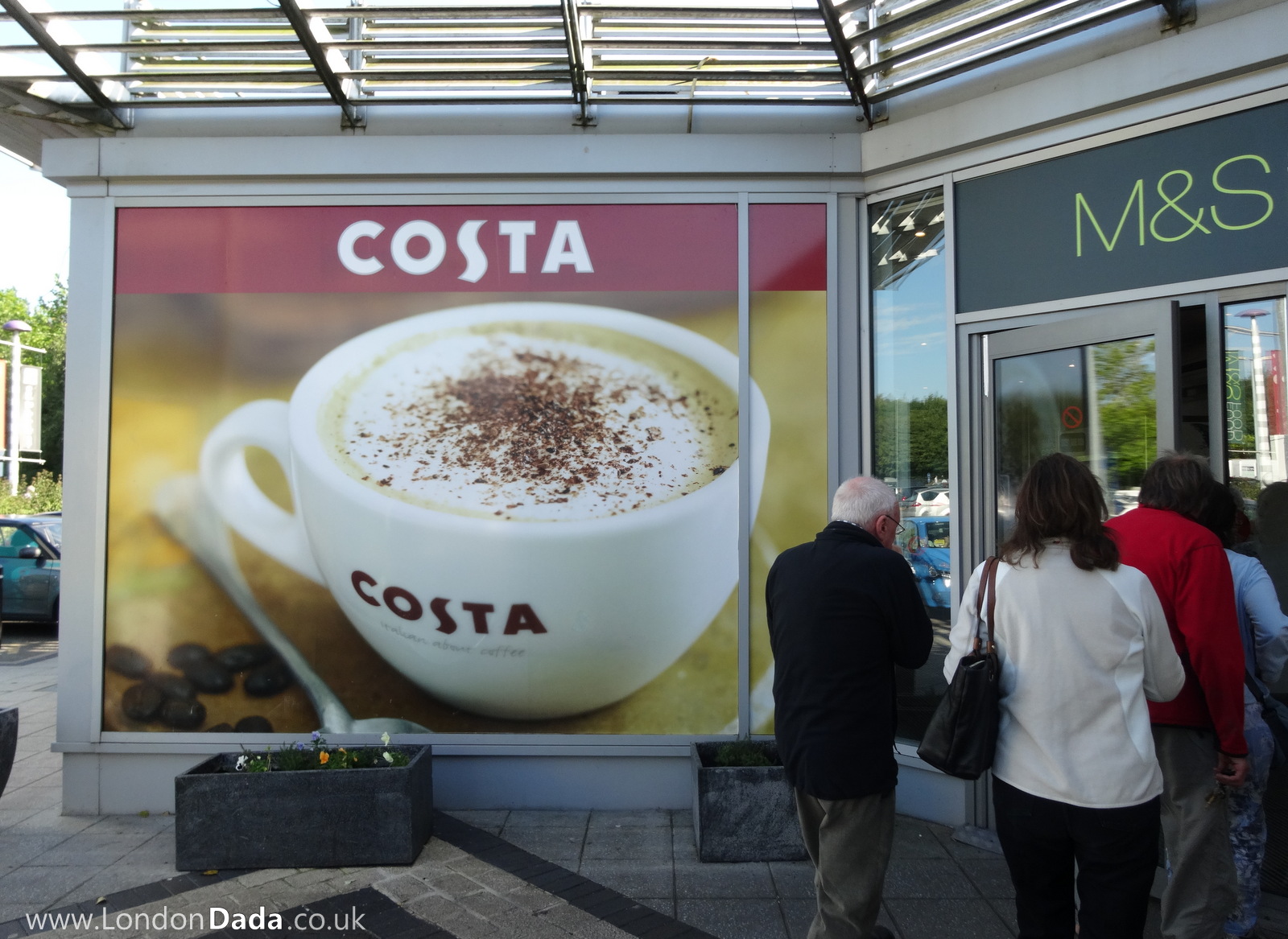After passing the in-your-face poster and immediately beyond the swing doors entrance and in plain line of sight at the end of a mini shopping mall corridor, lies, of course, a sprawling COSTA coffee establishment. How many weary and traffic-fazed travellers have linked the unavoidable sight of a picture of a gigantic cup of Costa as they enter the services, with the idea that then springs to mind on the other side, to rather fancy an actual cup of the same over there?