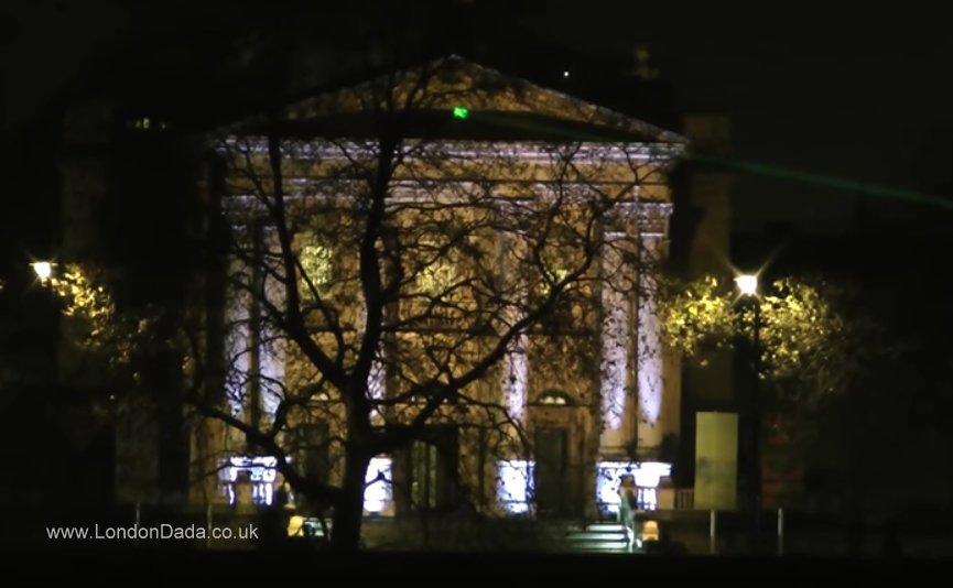Turner Prize 2016 Dada protest happening work comprising a single green laser light projected across the River Thames onto the E. facing top stone gable facade of Tate Britain, Millbank, London on the evening of the 5th December 2016 as the Turner Prize presentation award was being held within.