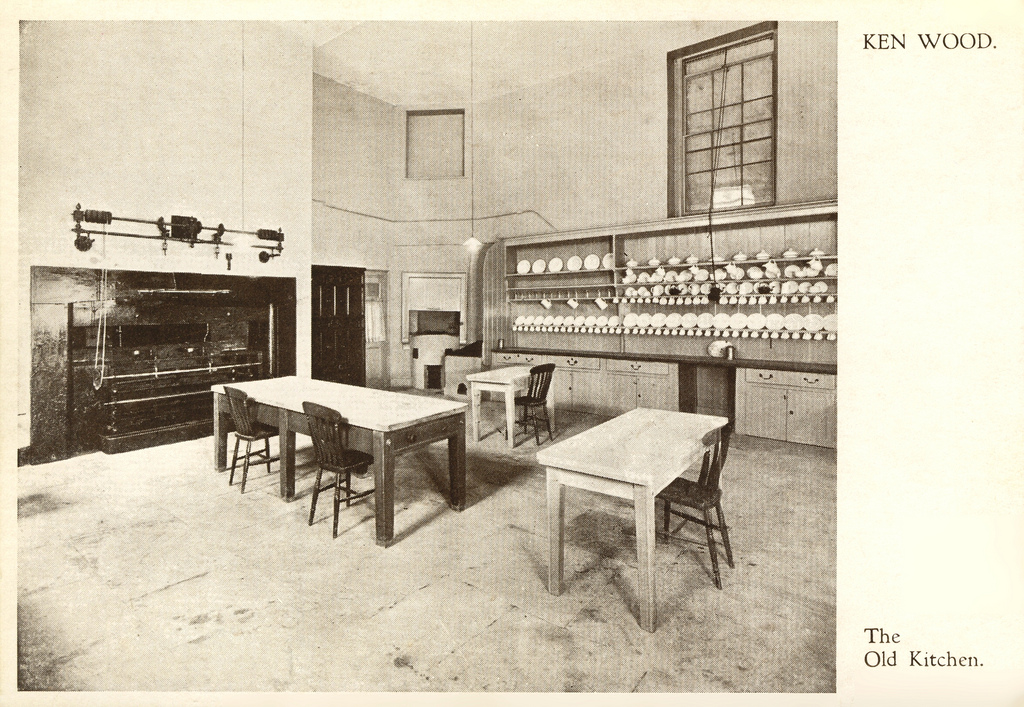 Victorian cooking range and visitor in the old kitchen, Kenwood House Highgate.