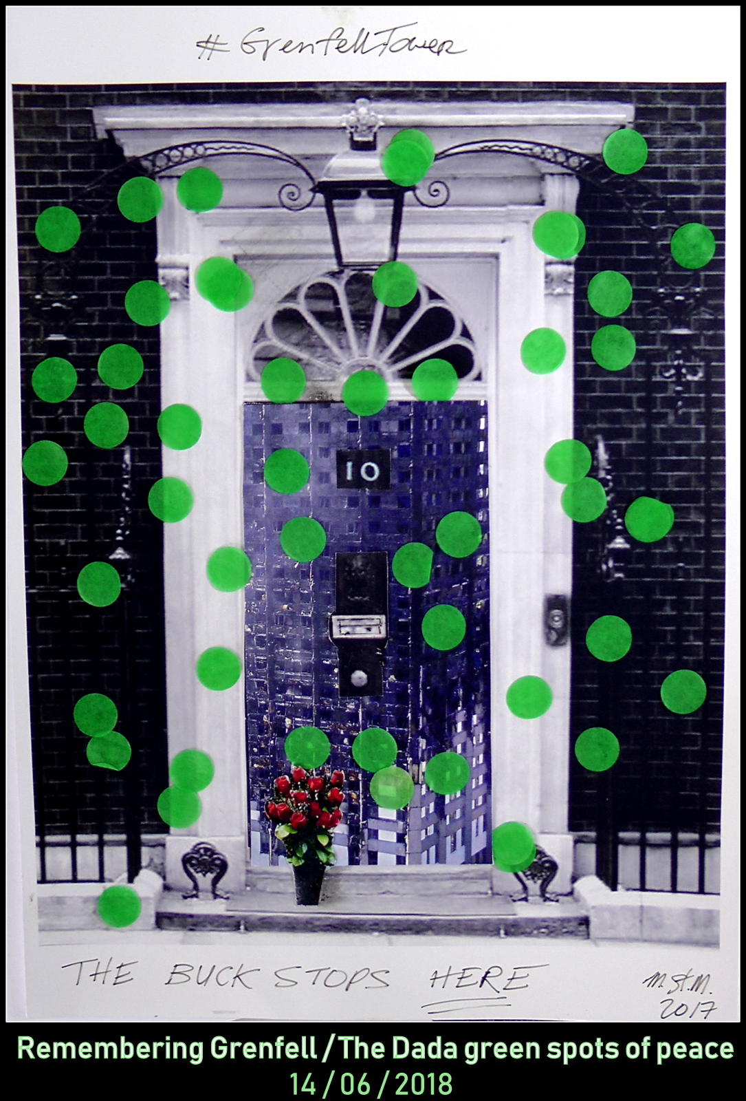 In solidarity with the Grenfell survivors in their fight for justice and for those responsible by neglect to be brought to justice; the Dada green spots of peace scattered within the 6191 London Dada gallery, Shoreditch
