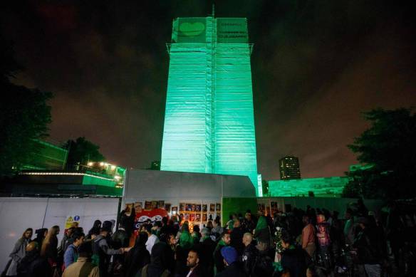 The Dada green spots of peace synchronizing with the color green chosen on the first anniversary to symbolize the range of heartfelt emotions associated with the aftermath of the Grenfell fire that killed 71 people ( official figure only ) . A Sea of Green for Grenfell